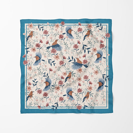 飛鳥與野花雙面真絲絲巾-土耳其藍(藍綠)