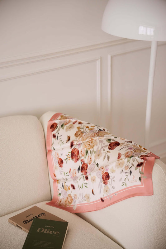 花束與蝴蝶雙面真絲絲巾-珊瑚粉(粉橘) - S