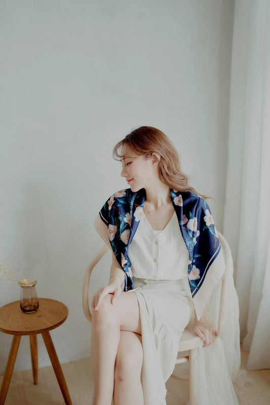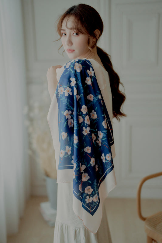 - 寧靜茶花雙面真絲絲巾 - 午夜藍 - 深沉優雅的午夜藍,茶花圖案靜謐雅緻,百搭實用的送禮之選