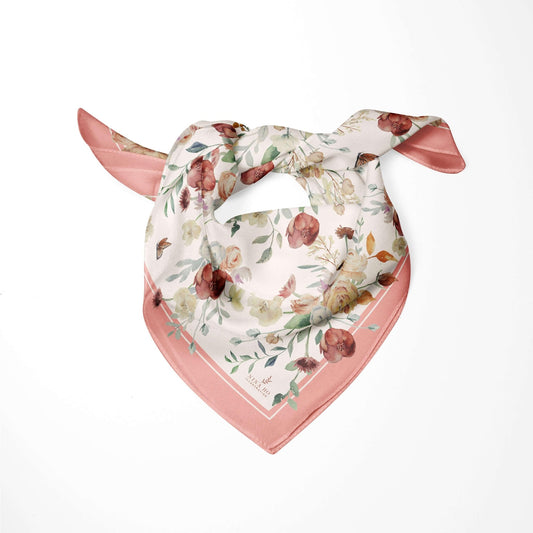 - 花束與蝴蝶雙面真絲絲巾 - 珊瑚粉 - 幸福感的花束,溫暖的粉橘色調