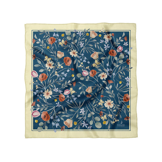 - 花叢派對雙面真絲絲巾-深藍 - 深藍底色,自然系田園野花,靜奢中的活力點綴