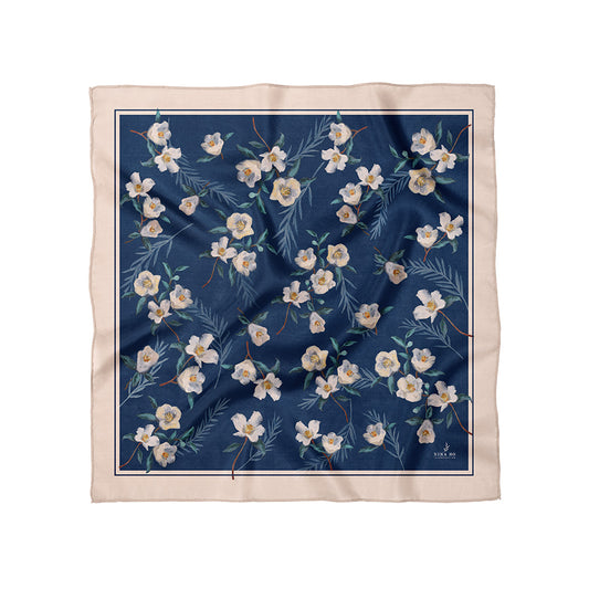 Tranquility Camellia Double-Sided Silk Scarf - Midnight Blue